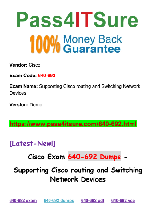 Compared with other brands, Pass4itsure has up to dated exam information, affordable price, instant exam PDF files downloaded, error correction, unlimited install,etc. Such as Pass4itsure Latest Upload Cisco 640-692 Dumps Exam, Real Cisco 640-692 Dumps Real Testing Are The Best Materials,We Help You Pass Supporting Cisco routing and Switching Network Devices. Simple and Easy! To take advantage of the guarantee, simply contact Customer Support, requesting the exam you would like to claim. Pass4itsure guarantee insures your success otherwise get your MONEYBACK!